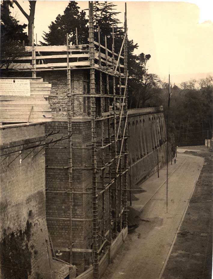 | L’edificio degli ascensori è costruito a ridosso del muraglione del Pincio e contiene la stazione inferiore sul viale del Muro Torto, il pozzo per le cabine e le scale di esercizio, la stazione superiore al piano del Pincio e la sala macchine; il dislivello tra le due stazioni è di 14,90 metri. Nella parte centrale del pozzo è stata ricavata la scala di servizio, della quale la prima e l’ultima rampa sono del tipo a pioli, mentre le altre rampe sono in cemento armato con gradini normali; lungo questa scala si hanno cinque ripiani in corrispondenza dei quali esistono chiusure che permettono l’entrata e l’uscita dalle cabine ad altezze intermedie. La necessità dei due tratti terminali della scala, costruiti a pioli, deriva evidentemente dalla ridotta profondità degli androni inferiore e superiore, che non permetteva di ospitare anche le rampe iniziali della scala; d'altronde, dalle immagini si vede chiaramente il ridotto ingombro che l'impianto occupa nella sezione trasversale della strada. | ||||